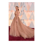 Appropriately enough, one of the biggest trends on the red carpet this year was white! Aisle-worthy white dresses embellished the evening. Beyond the bridal hue, many leading ladies decided to take the plunge this year. We’re referring to plunging necklines, of course. Many of you may have noticed that embellishments were also a huge red carpet trend. From sparkly beads and sequins to textured details, many Oscar gowns were embellished to perfection! On the darker side, we saw deep shades of lipstick that created a stylish contrast with the popular blush and white gowns chosen for the evening. Which trend would you consider for your wedding day? Would you step outside the box and opt for dark lipstick on your special day? The fashion compass is pointing in a plunging, embellished, and romantic direction. We can expect to see many bridal gowns reflecting these gorgeous trends through the spring, summer and fall. Not only will we see these looks in bridal fashion, but many brides-to-be will consider these red carpet moments when shopping for bridesmaid dresses, as well! Here are our top three favorite looks from the stylish Academy Awards.